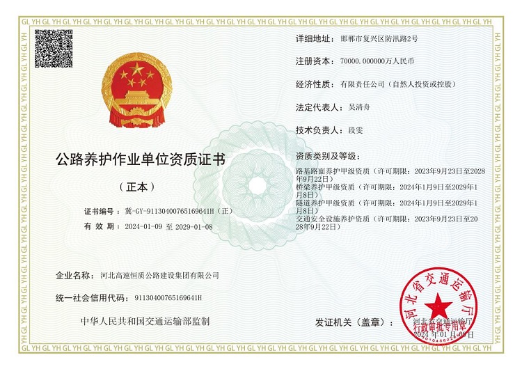 河北高速恒質公路建設集團有限公司始建于2004年,前身是邯鄲市恒質公路建設集團有限公司。2024年7月成為河北高速公路集團有限公司二級子公司,現有職工500余人,下轄18家子公司13個分公司,參股公司3家 ,注冊資本7億元,是一家集公路工程施工、路用材料研發生產、試驗檢測、瀝青貿易、公鐵物流于一體的多元化、綜合性單位,國家級高新技術企業,河北省專精特新中小企業,河北省首家瀝青拌合環保引領性企業。公司擁有公路工程總承包壹級、公路交通工程(公路安全設施)專業承包壹級、機電工程施工總承包貳級、電力工程施工總承包貳級、市政公用工程施工總承包貳級、建筑工...